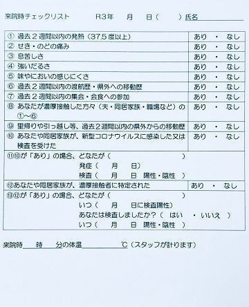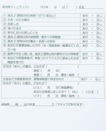 当院では引き続き、玄関でのチェックリストの記入等、感染予防策を継続していきます。