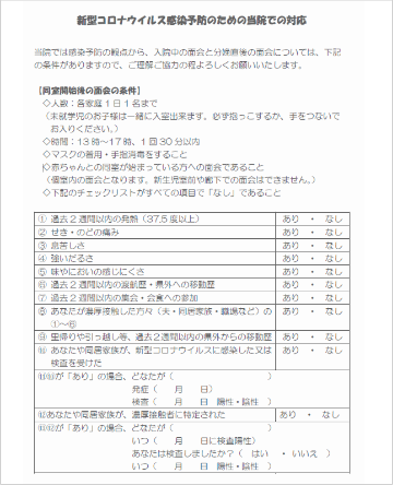 これまで使用してきたチェックリストから、県外の移動歴を削除します。それに伴い、面会の条件も変更となりましたので、こちらをご確認ください。