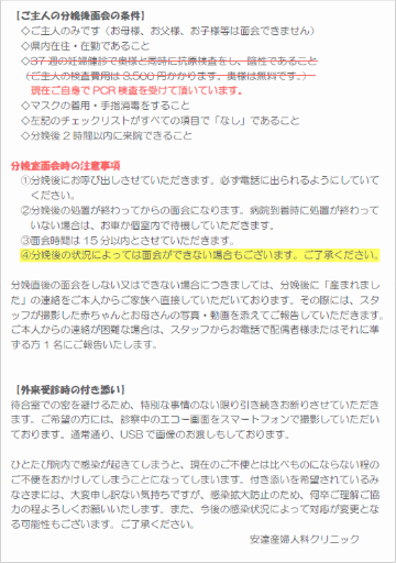 現在の状況を重く受け止め、面会と立会い分娩についても引き続き中止させていただきます。