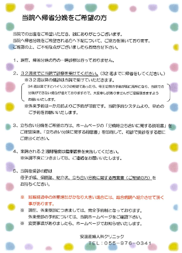 混雑緩和のため、9月より当面の間当院での分娩予定の方のみ妊婦健診をお受けすることになりました。帰省分娩など、他院で出産予定の方には大変申し訳ございませんが、早めに帰省していただくか、ご自身の通いやすい病院にて妊婦健診をお受けいただくようご協力お願いいたします。対象の方は8月中に紹介状をご用意させて頂きます。大変ご迷惑をおかけいたしますが、ご理解とご協力をお願い申し上げます。